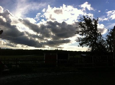 Idag var det ett otroligt vackert och mystiskt skådespel på himlen! Under en ridlektion hann vi uppleva spöregn, sol, en underbar regnbåge och... hagel! Herrejösses vilken hagelskur! Hundarna sprang in i stallet och hästarna på ridbanan undrade om kriget hade brutit ut när dom blev pepprade på volten. Det var så stora hagel att det gjorde ont när man fick dom på sig. Sen blev det kallt, men soligt. ♥Det var märkligt att se, nästan lite kusligt.. ♥Hagel på Zoyas rumpa.Hagel på marken.Man såg ovädret komma mot oss.. Den otroligt vackra regnbågen! ♥Tillsist kom solen ♥Var rädda om er ♥Många kramar från Linda och alla djuren!